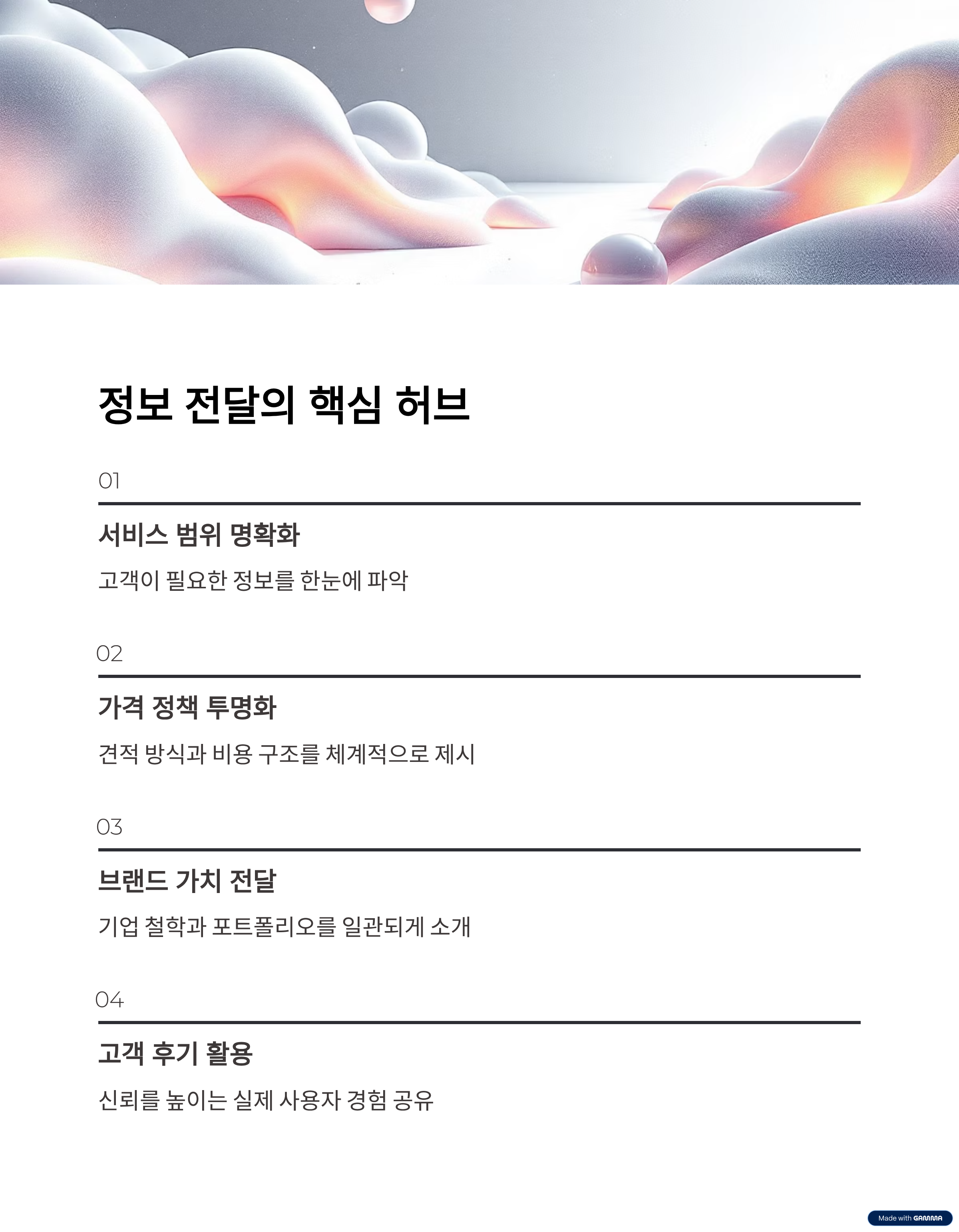 서비스 소개, 가격 정책, 포트폴리오, 고객 후기 등 핵심 정보를 한곳에 정리해 보여줄 수 있어