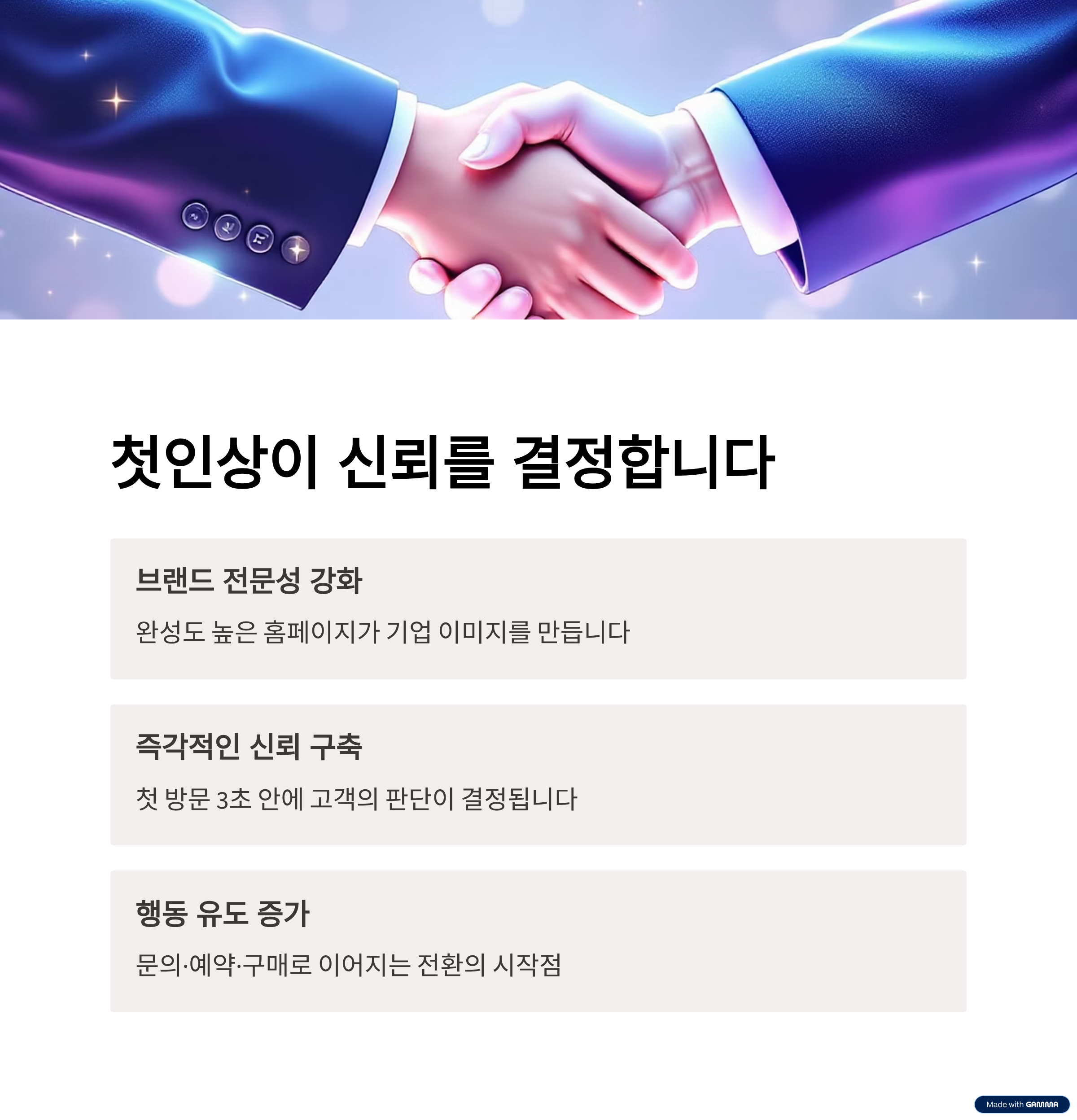반대로 깔끔한 UI, 명확한 구조, 완성도 높은 콘텐츠는 전문성을 강화하고 깊은 신뢰를 형성합니다.